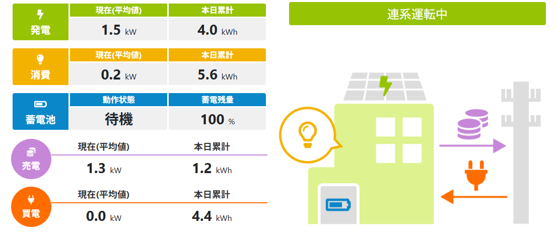 - 計画的な電力使用 日中の発電量が多い時間帯に消費電力の大きい家電(炊飯器や電気ポットなど)を使い、夜間は蓄電池からの電力で照明や冷蔵庫など最低限の機器を動かす、といった計画的な運用ができます。